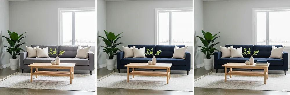 Hoàn hảo cho mockup sản phẩm, bắt đầu với: “Ảnh chất lượng cao của phòng khách tối giản, ghế sofa xám nhạt, bàn gỗ sáng bóng, chậu cây lớn xanh tươi.” Tiếp theo: “Đổi màu ghế sofa thành xanh navy đậm, thêm họa tiết kẻ sọc tinh tế.” Rồi: “Thêm chồng ba quyển sách cổ điển trên bàn, với bìa da nâu.” Gemini chỉnh sửa cục bộ, giữ nguyên toàn cảnh, giúp bạn nhanh chóng hoàn thiện thiết kế nội thất hoặc catalog sản phẩm.