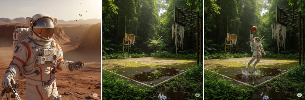 Kết hợp các prompt riêng lẻ để tạo bất ngờ: “Ảnh siêu thực tế của phi hành gia mặc bộ đồ không gian trắng bóng.” Kết hợp với: “Ảnh sân bóng rổ bỏ hoang trong rừng nhiệt đới um tùm.” Kết quả: “Phi hành gia đang úp rổ mạnh mẽ trong sân bóng này, với lá cây vươn ra từ các khán đài.” Kỹ thuật này lý tưởng cho nội dung viral, kết hợp yếu tố bất ngờ để thu hút khán giả.