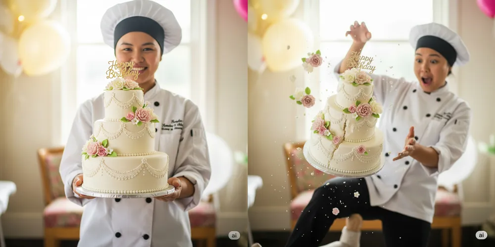 Xây dựng dựa trên logic đời thực: “Ảnh một người phụ nữ trẻ cầm chiếc bánh kem 3 tầng trắng tinh, trang trí hoa hồng đỏ.” Tiếp: “Cho xem chuyện gì xảy ra nếu cô ấy bị vấp ngã bất ngờ.” Gemini sẽ tạo hình ảnh hợp lý: bánh kem rơi vãi, biểu cảm kinh ngạc trên khuôn mặt, thêm chi tiết như kem bắn tung tóe. Điều này tuyệt vời cho minh họa hài hước hoặc giáo dục an toàn.